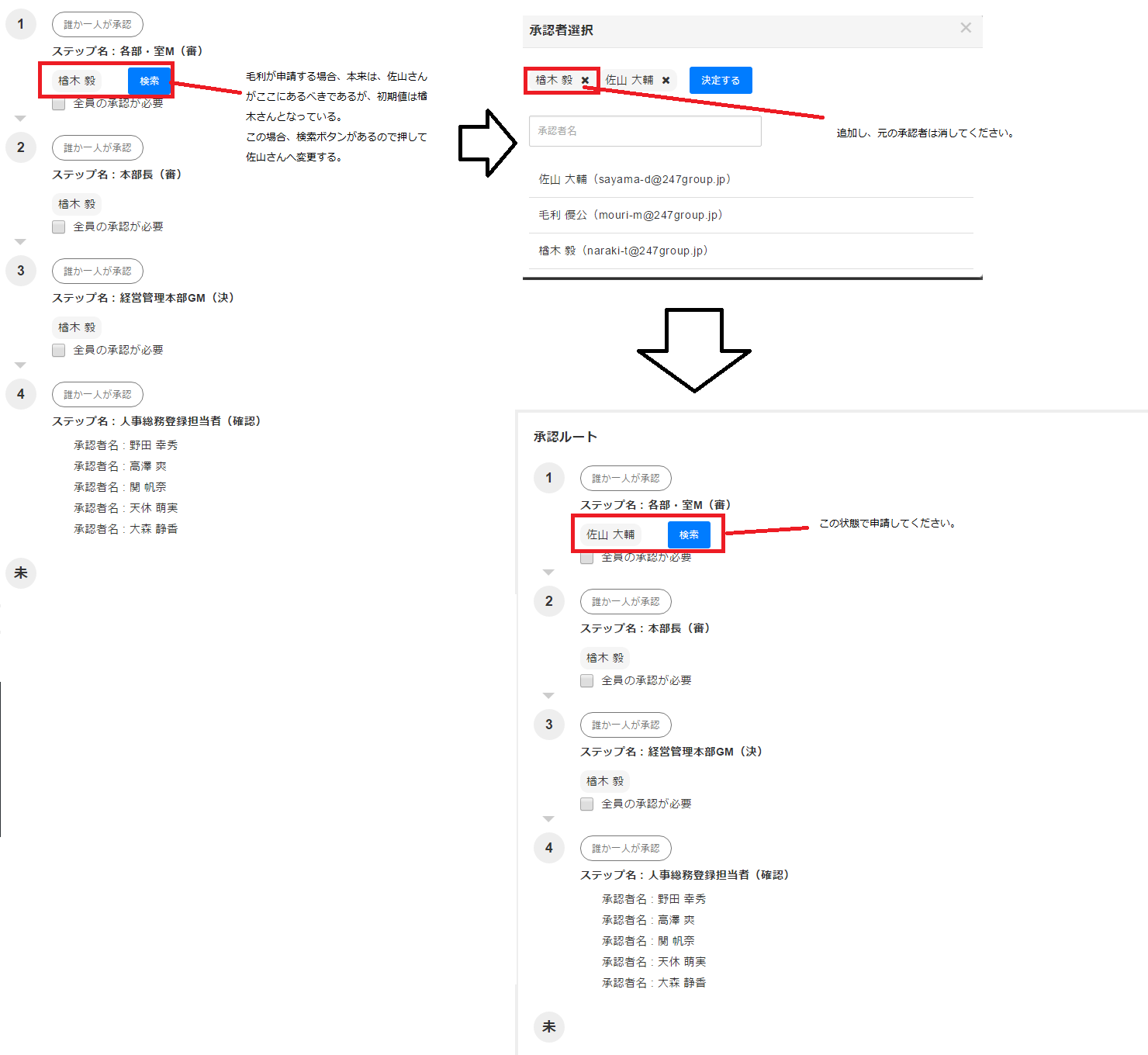 例)情報システム部の毛利Mの申請でマネージャー承認ステップの所に上位役職の楢木GMが初期値になっている。(適正は佐山SM)