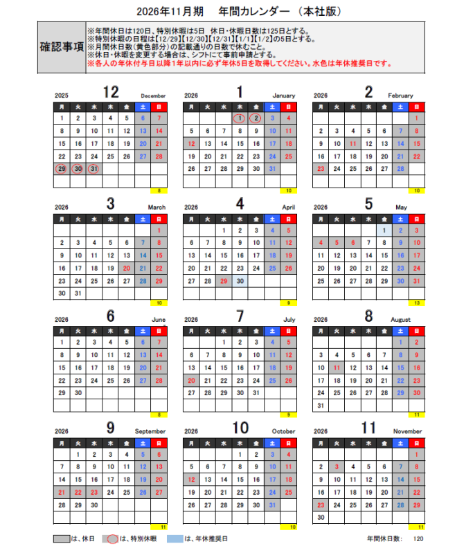 本社:年間カレンダー
